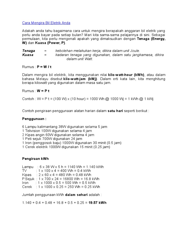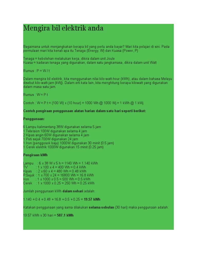 Arkadaşlar atıyorum 400 watt lık bir ürünün 1 saatte çektiği elektriği nasıl hesaplarım? Elektrik kw fiyatı nasıl hesaplanır? Elektrik faturası tüketim hesaplaması nasıl yapılır? Jumlah tenaga elektrik yang dipindahkan (transferred) dalam masa satu saat. Cerek elektrik ini, dengan kapasiti 2,200 w dan jumlah 1.7 liter, jadi air di dalamnya sangat cepat untuk mengira penggunaan elektrik, mari ambil teko pada 2000 watt, cerek akan dipanaskan 7 kali.